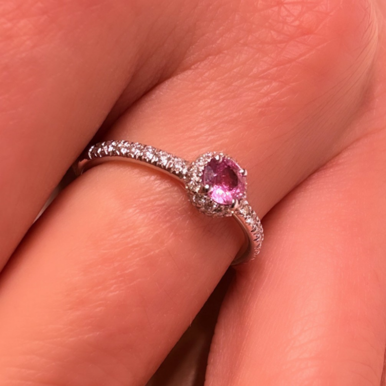 Raffinato e luminoso, questo anello in oro bianco 18kt esalta la delicatezza di uno zaffiro rosa centrale, circondato da un'aurea di diamanti bianchi che ne amplificano la brillantezza. Il gambo sottile , impreziosito da pavé di diamanti, dona continuità di luce e un'eleganza senza tempo. Un gioiello romantico e sofisticato, perfetto per chi ama i dettagli preziosi e femminili, con un tocco contemporaneo. Ideale per regalo speciale, anniversario, promessa o occasione importante.