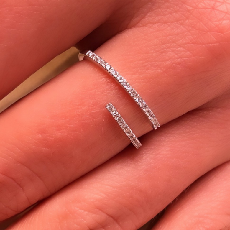 Anello in oro bianco 18 carati dal design moderno e minimal, caratterizzato da una struttura aperta e leggermente regolabile. Le due linee sottili si rincorrono creando un effetto dinamico ed elegante, impreziosito da una fila di diamanti taglio brillante sulla parte superiore che dona luce e raffinatezza. Il contrasto tra la uperficie liscia e quella diamantata valorizza il design, rendendolo contemporaneo e molto versatile.
