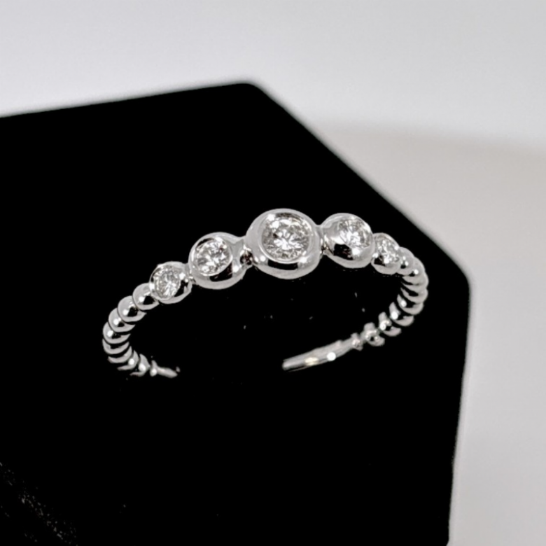 Anello raffinato in oro bianco 18kt, caratterizzato da una composizione di diamanti taglio brillante disposti in sequenza scalare. Le pietre, incastonate a castone liscio, creano un elegante gioco di volumi e luce , con una progressione armoniosa che valorizza il dito in modo delicato ma distintivo. Il design moderno e pulito lo rende perfetto sia come anello singolo che in abbinamento ad altri gioielli, ideale per un look contemporaneo e luminoso.