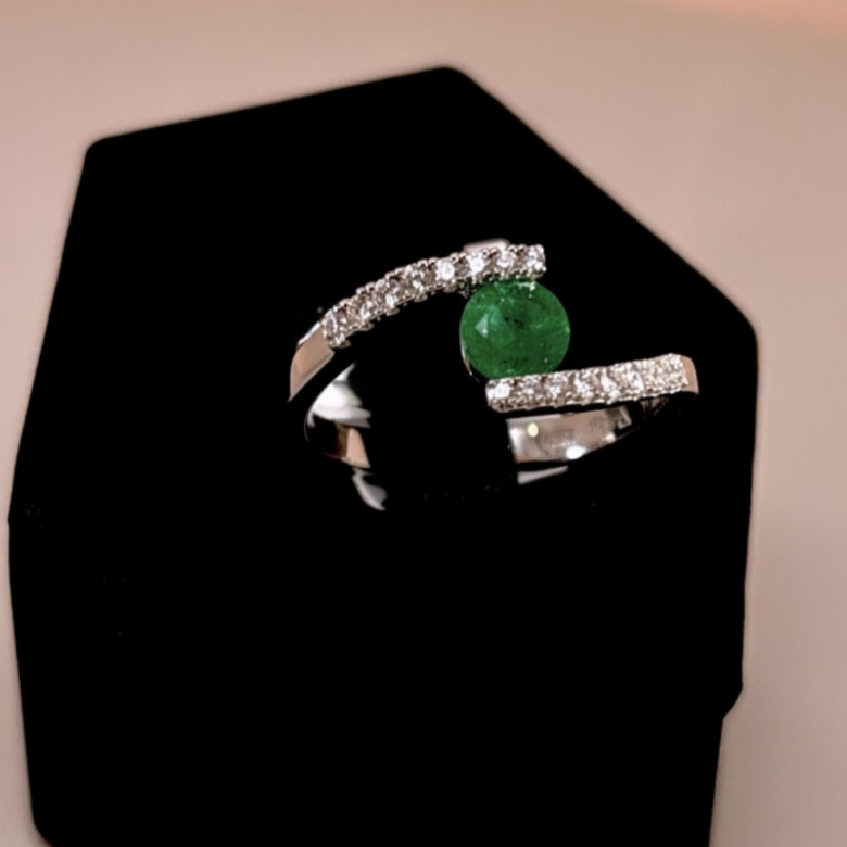 Un anello raffinato e contemporaneo in oro bianco 18kt caratterizzato da una linea aperta che valorizza al centro uno smeraldo naturale dal colore intenso e luminoso. Ai lati, una doppia fila di diamanti incastonati a pavé esalta la pietra centrale , creando un contrasto elegante e sofisticato. Il design esenziale ma distintivo rende queto gioiello perfetto sia per un utilizzo quotidiano di classe sia come pezzo speciale per occasioni importanti. Un anello che unisce freschezza e raffinatezza, ideale per chi cerca un tocco di colore prezioso con un'eleganza senza tempo.
