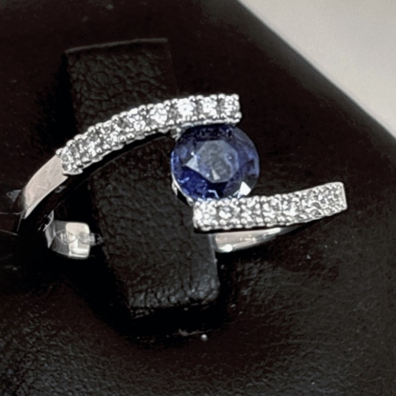 Anello in oro bianco 18kt con zaffiro naturale centrale da 0,49 ct e pavé di diamanti per un totale di 0,17ct. Il design essenziale e contemporaneo avvolge la pietra , esaltandone la profondità e creando un raffinato contrasto con la brillantezza dei diamanti. Un gioiello elegante e distintivo, pensato per chi ama uno stile raffinato e senza tempo.