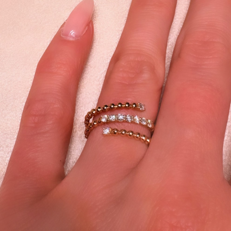 Un anello raffinato e contemporaneo, caratterizzato da una struttura a spirale che avvolge il dito con leggerezza e movimento. Realizzato in oro rosa, combina file lisce a micro-sfere con una linea centrale impreziosita da diamanti naturali, creando un contrasto luminoso e sofisticato. Il design aperto e dinamico dona profondità e tridimensionalità, rendendo questo gioiello estremamente femminile e distintivo. Perfetto da indossare da solo come protagonista o abbinato ad altri pezzi per un look più deciso. Un anello versatile e di carattere, pensato per chi ama i dettagli preziosi con un tocco di originalità.