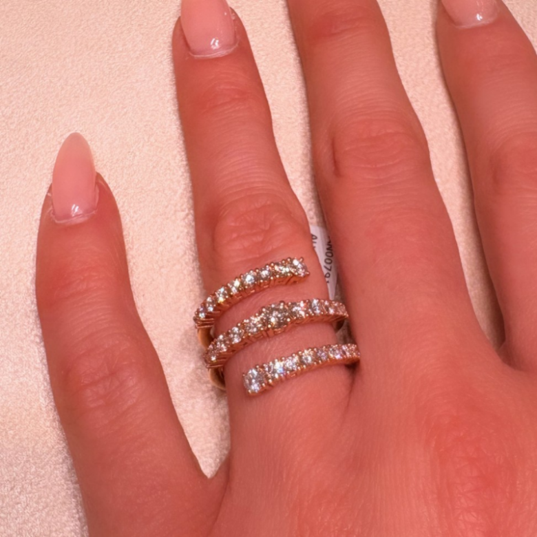 Le file di diamanti sono incastonate con precisione lungo tutta la struttura, esaltando ogni curva con una brillantezza continua e raffinata. Il risultato è un equilibrio perfetto tra modernità e lusso, ideale sia per occasioni speciali che per dare personalità a un look quotidiano. Un anello che non passa inosservato: una dichiarazione di stile, luce e femminilità.