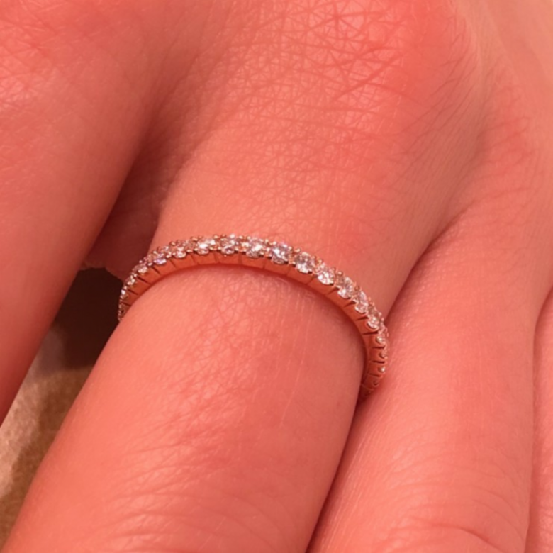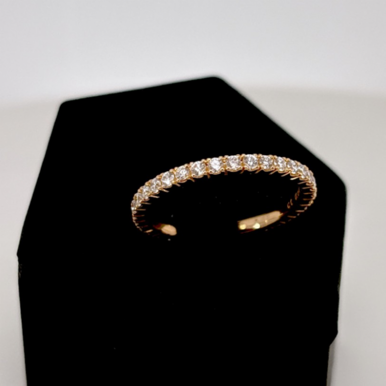Fedina in oro rosa 18 carati dal design essenziale ed elegante, impreziosita da una linea continua di diamanti naturali taglio brillante. La montatura sottile valorizza la luce delle pietre, creando un effetto luminoso raffinato e senza tempo. Perfetta da indossare singolarmente o in abbinamento ad altri anelli. Un gioiello versatile, simbolo di eleganza discreta e quotidiana.