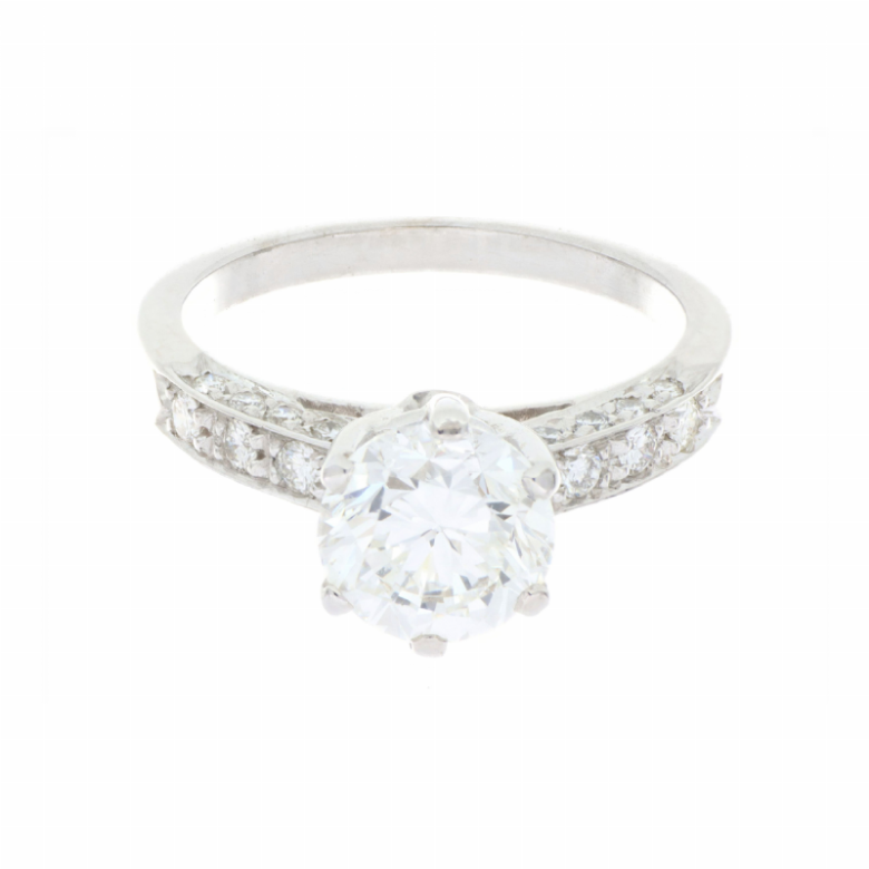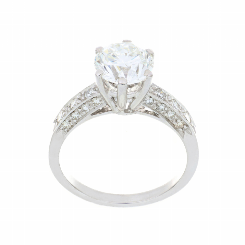 Anello in oro bianco con diamante centrale e diamanti sul gambo