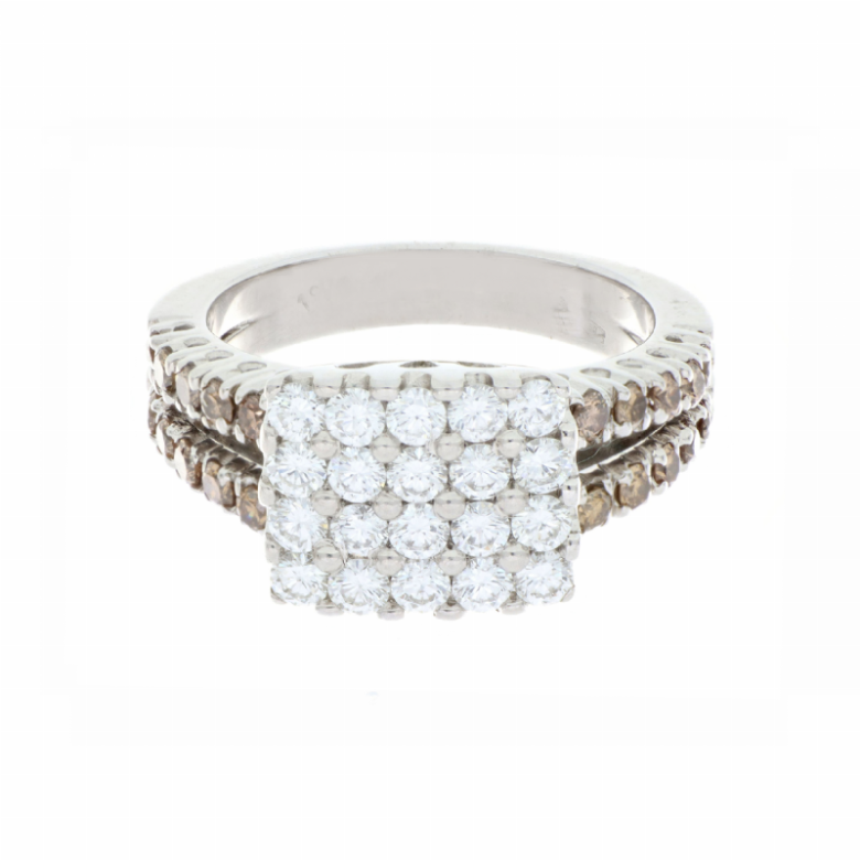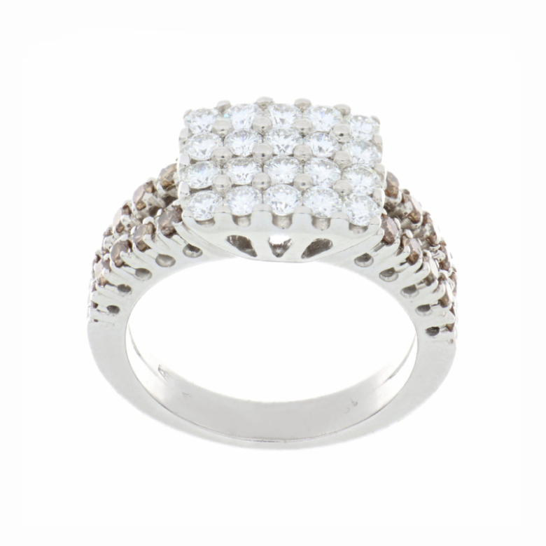 Anello in oro bianco con diamanti centrali e diamanti brown laterali