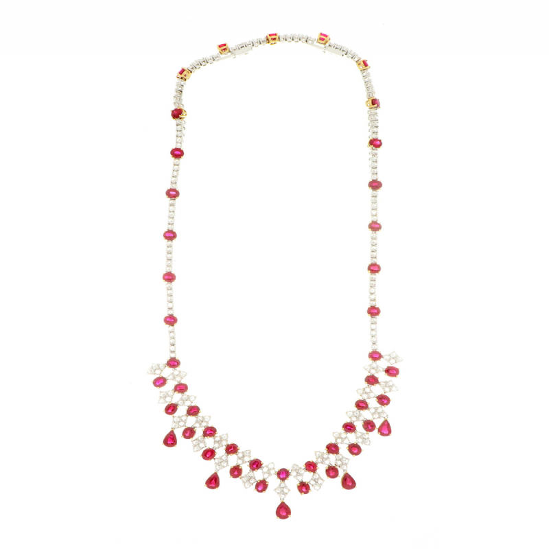 Collier in oro bianco con 47 rubini birmani scaldati (42 rubini taglio ovale e 5 rubini taglio a goccia) e 190 diamanti taglio antico