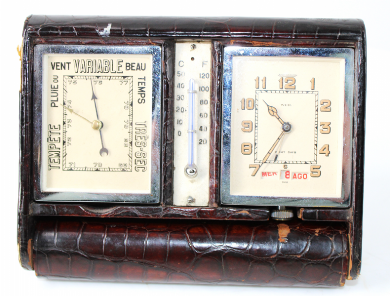 Due quadranti rettangolari separati da un termometro, a destra orologio con 8 giorni di carica e a sinistra barometro