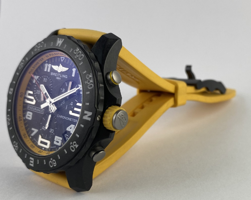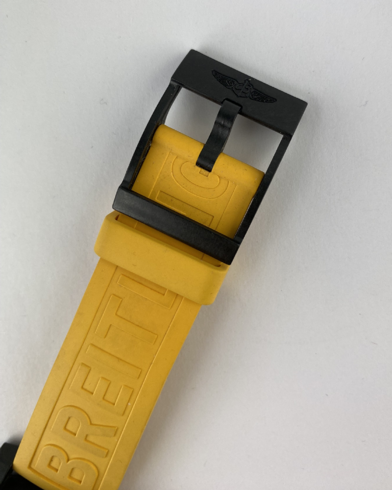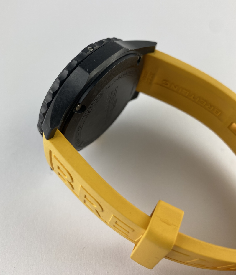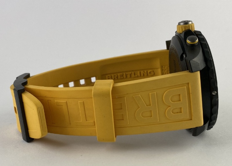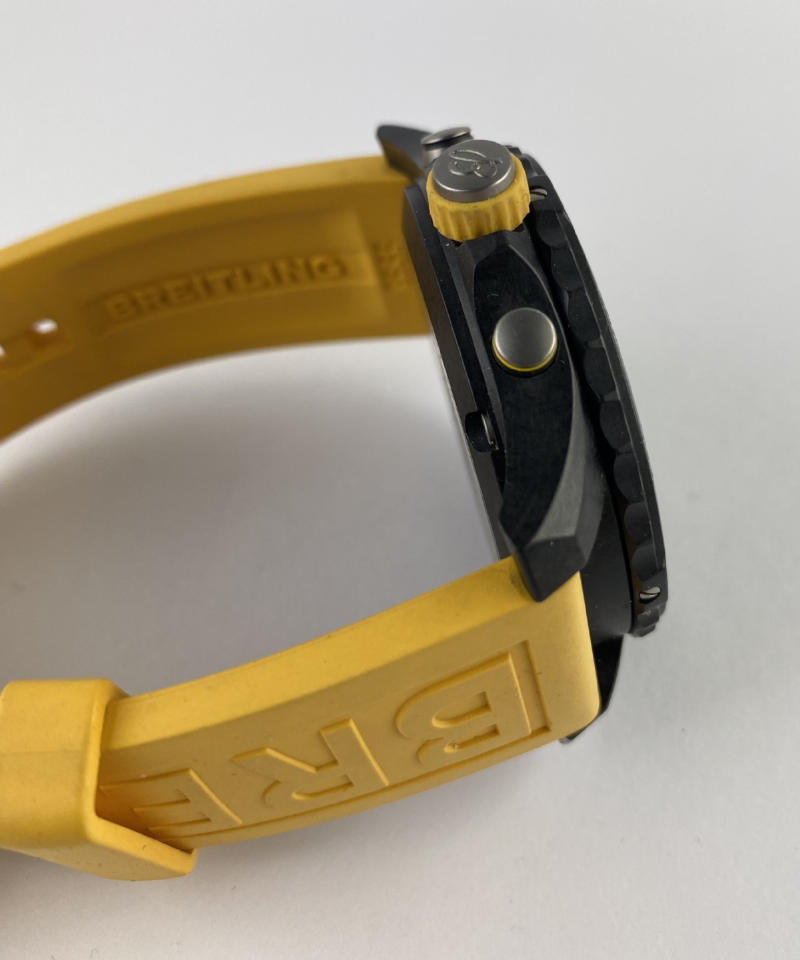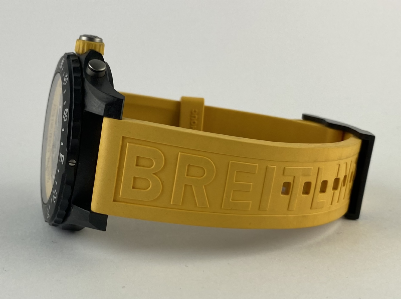 Orologio cronografo sportivo cassa 44 mm, materiale sviluppato da Breitling: Breitlight, è un materiale composito leggero e resistente, introdotto nel 2016. È un materiale ipoallergenico, resistente ai graffi, alla trazione e alla corrosione. Le sue caratteristiche includono una sensazione più calda al tatto rispetto ai metalli e una finitura leggermente testurizzata. Movimento al quarzo, con datario. Anno di produzione 2023. Vetro zaffiro, fondello serrato con 4 viti. Resistente all'acqua 10 bars (100 m/330 ft). Cinturino in caucciù, lunghezza 12+8 cm. Completo di scatola e garanzia. Spedizione assicurata e tracciabile.